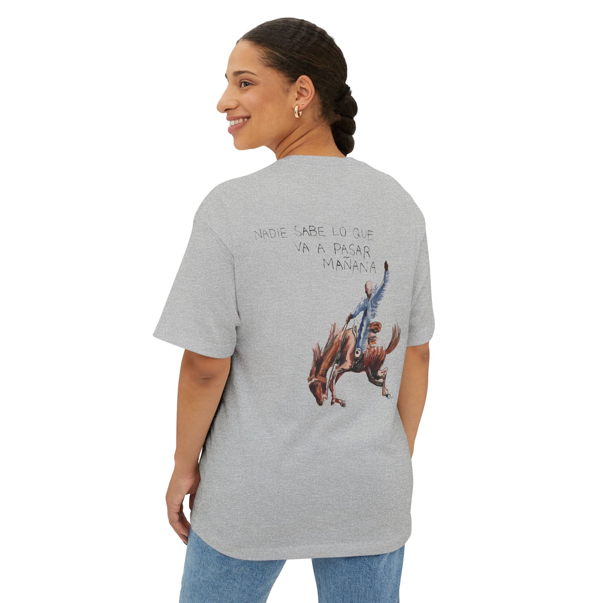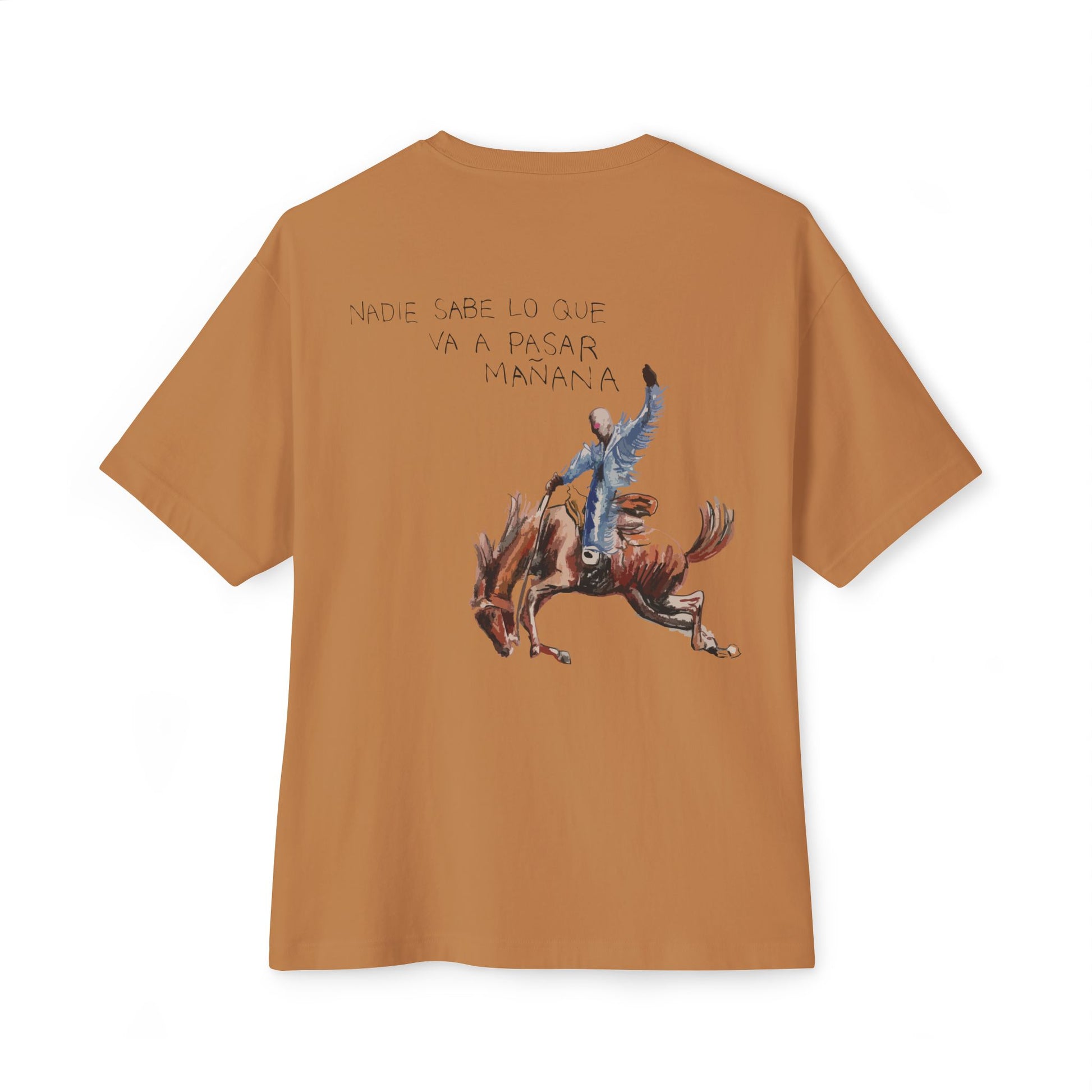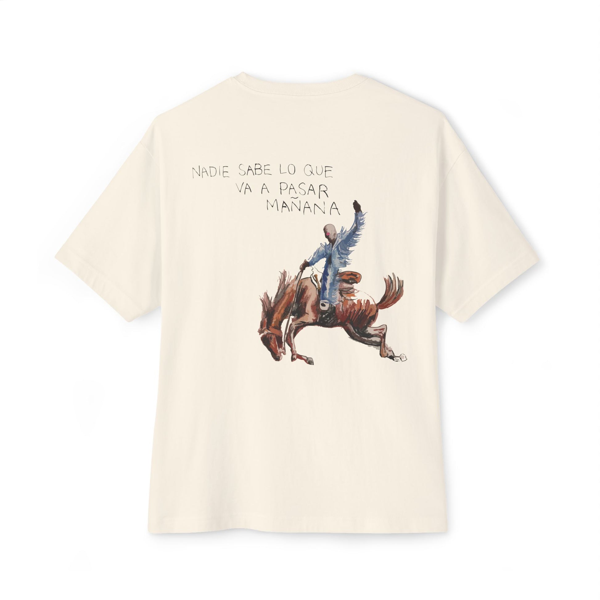 A subtle BB logo on the front keeps the design minimal and intentional, while the back features a striking horse graphic paired with the phrase “Nadie sabe lo que va a pasar mañana”, blending artistic expression with a thoughtful, poetic message. The dropped shoulders and relaxed silhouette give a modern, off-duty look that works with jeans, cargos, or layered long sleeves.